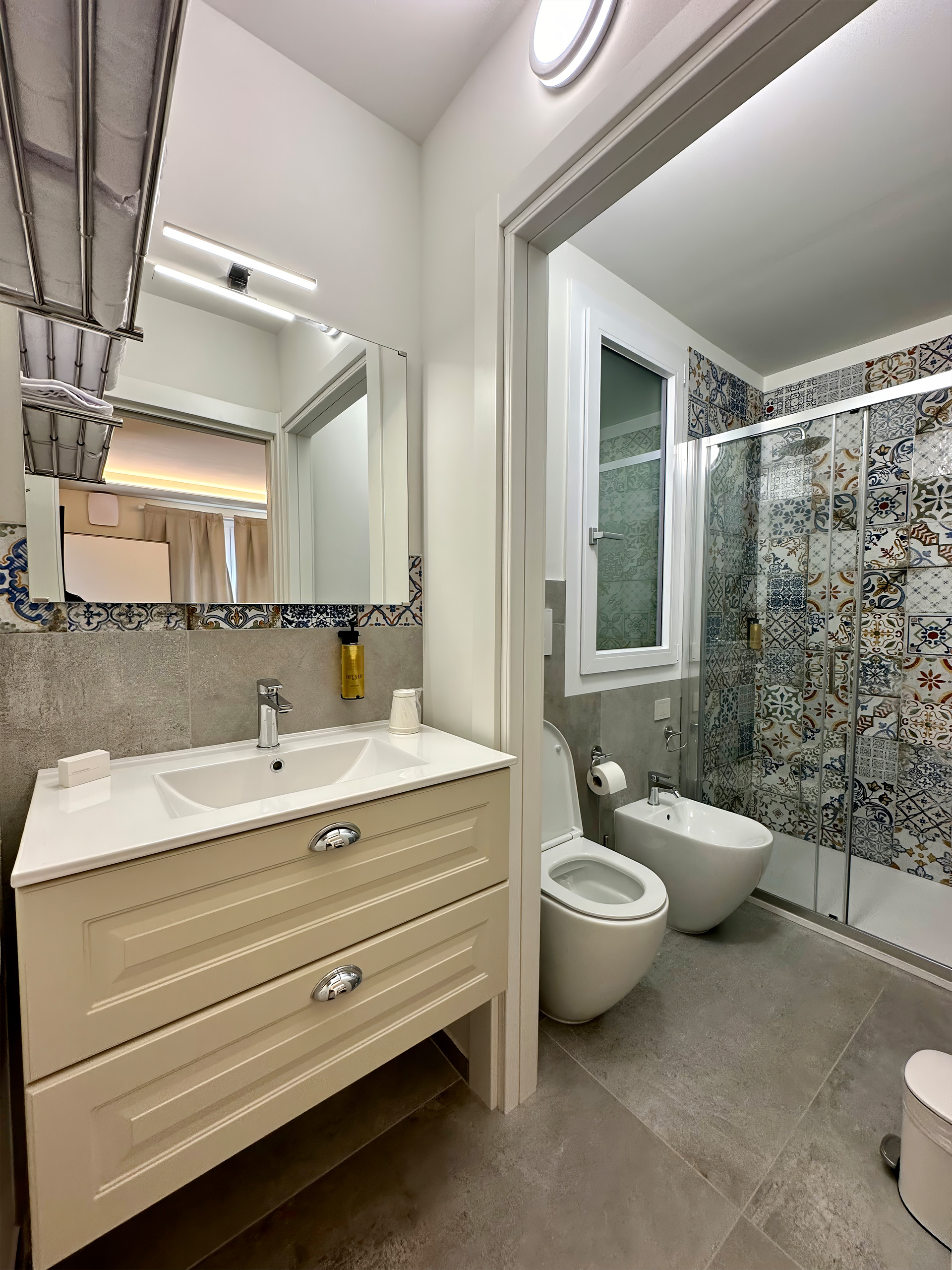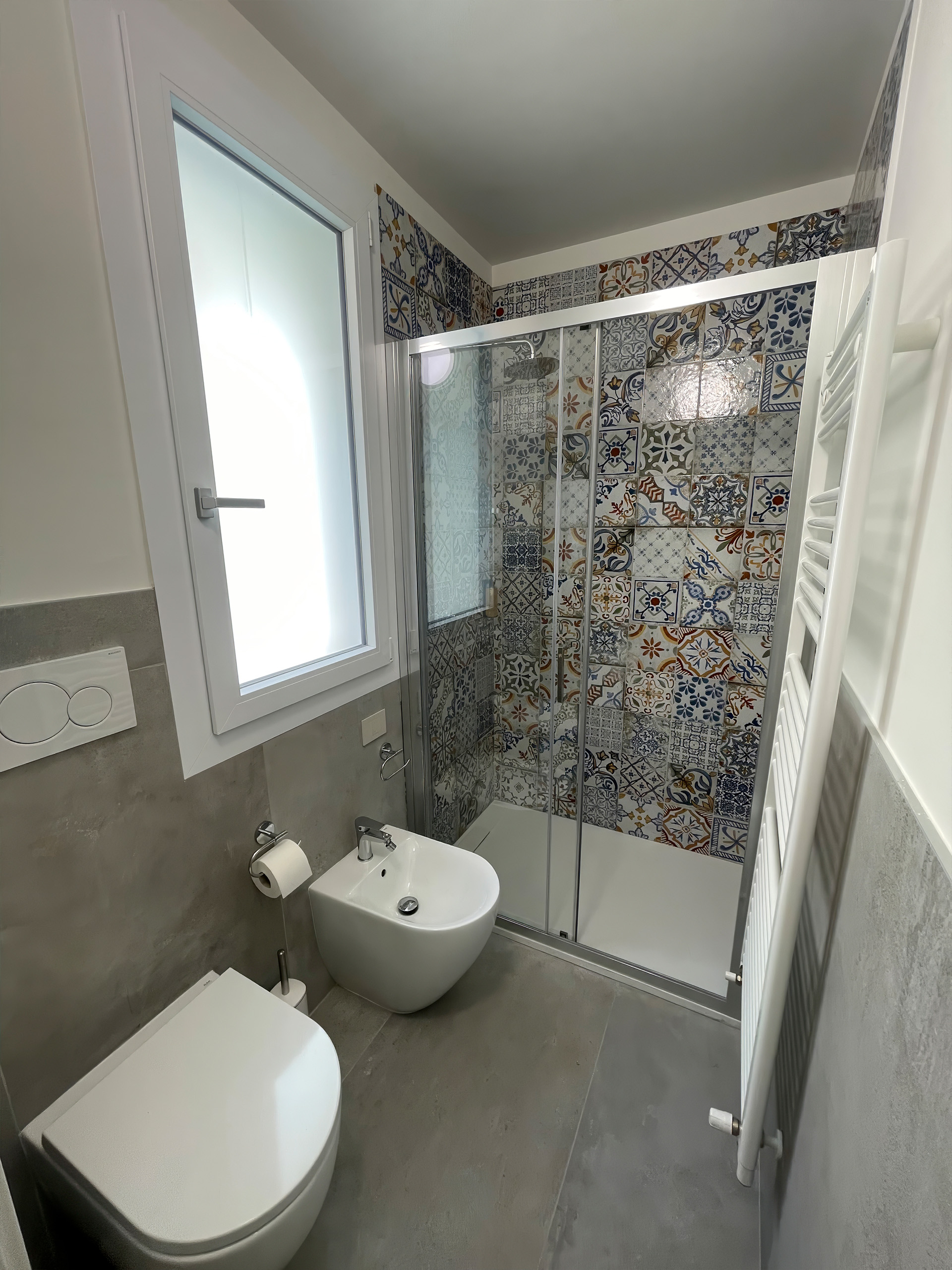 Il bagno spicca per la doccia con piastrelle artistiche, che donano colore e carattere all’ambiente.